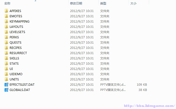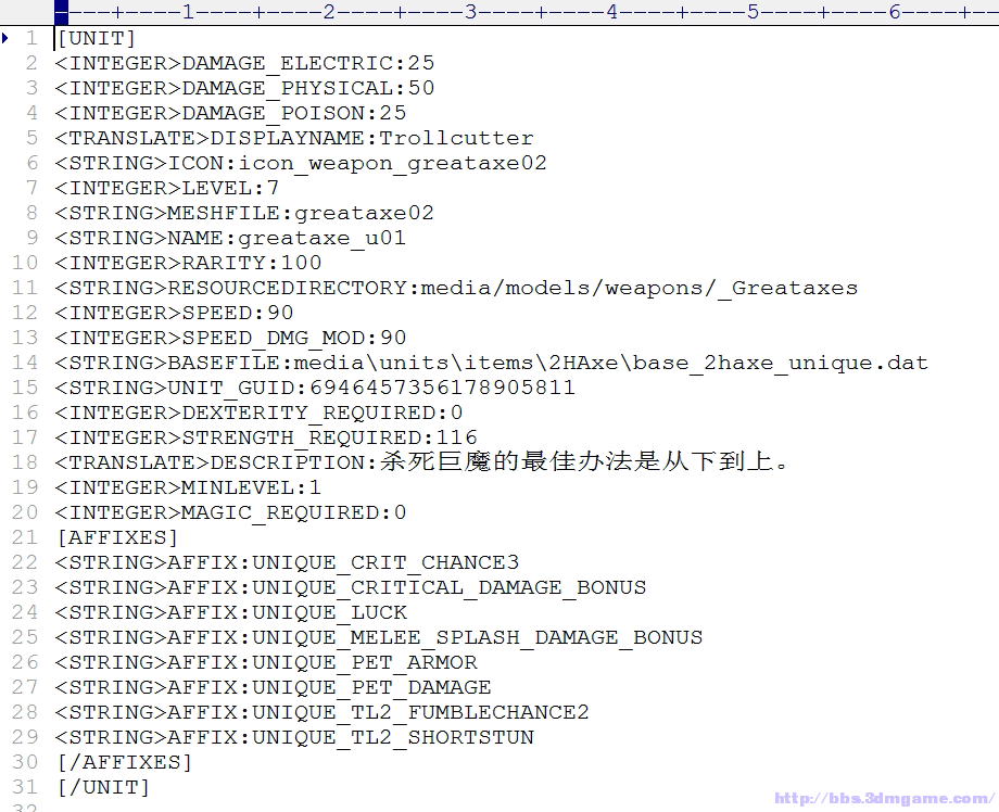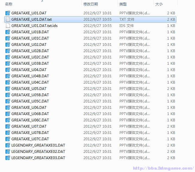 6、文件夹路径是MEDIA目录下有一堆很熟悉的子文件夹,基本上懂英语就明白文件夹是什么意思,这里就不多讲。选择UNITS\ITEMS\2HAXE\文件夹(2HAXE可能是2 Hand Axe的意思),看到了GREATAXE_U01.DAT这个文件,。这里就需要我们的第二个工具dat2txt