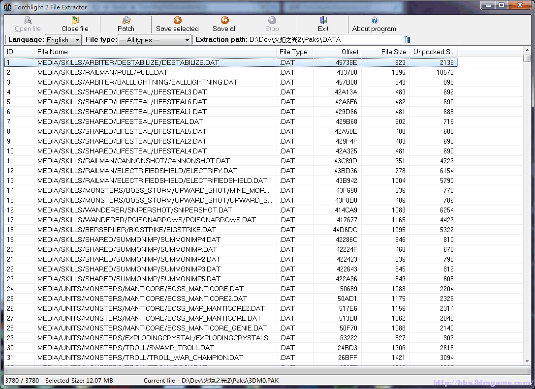 4、点击Open file,选择“火炬之光2”安装目录下的PAKS下的3DM0.PAK,建议先备份3DM0.PAK和3DM0.PAK.MAN。选择后出现了像Excel一样的表格。(我估计.MAN文件是.PAK文件的索引,求解)