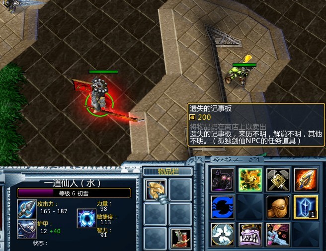 带上他去找孤独剑仙 可以得到孤独剑仙的笔记本(加防御200,闷骚技能每秒500点燃烧,生命5000点,力量115,敏捷95,移动速度30)