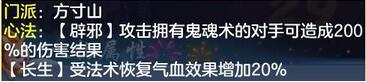 方寸的门派心法相对来说也是十分实用的,对于常规加点的方寸(一速或辅助封)辟邪基本上作用不大,是对于非主流的加点的方寸——魔方寸来说,辟邪就十分强大了,大幅度增加对鬼魂单位的伤害。在PK当中十分好用。而长生的作用比较明显。受法术恢复气血时效果会增强,包括特技,复活。所受到的治疗量都会增高。