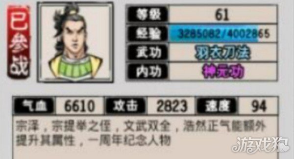 先去六扇门找南宫燕打听,触发支线结交宗泽,在去苏州找宗提打听,得知宗泽去游山玩水了,在去虎丘山顶找到宗泽劝他,然后又去宗提那找到宗泽,得知他不想跟你,然后去苏州境内完成三个小任务,回去告诉宗泽,获得人物宗泽,宗泽十分强大,建议替换上阵人物。