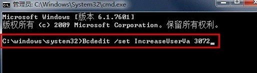 2、进入cmd命令框后,再输入命令:Bcdedit /set IncreaseUserVa 3072,完成之后,按Entel(回车)键确定即可,如下图:
