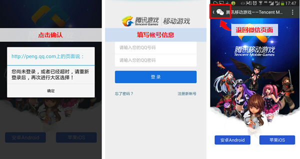 用QQ帐号绑定的用户,“确认”提示信息后,填写帐号信息登陆,成功后会返回平台选择页面,这时需要退出到公众号页面,再次点击“福利中心”。