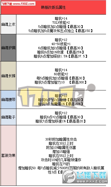 这是韩服幽魂套改版后的属性。总体而言被砍了三分之一!可惜国服用户辛辛苦苦刷深渊凑得一套幽魂,打孔附魔增幅。。结果呢说砍就被砍了!