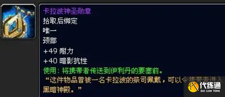 卡拉波勋章是黑暗神殿开门任务奖励,属性为49点耐力和40点暗影抗性。只要用户能够进入黑暗神殿,就必然会有这件装备,基本属于点击就送的。