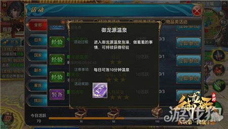 御龙源温泉是一个让玩家完全放松的地方,在这里小伙伴们可以进入御龙源泡泡温泉,做羞羞的事情。每位玩家每天可以泡澡十分钟,获得大量经验,实际上这是一个经验活动啦。泡温泉十分钟后,玩家不仅仅可以获得经验,还可以得到10个活跃点。