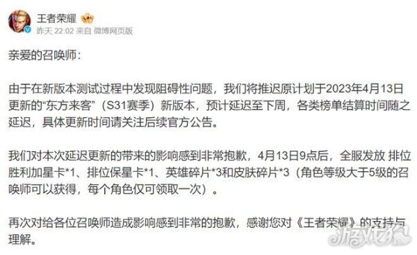 我们对本次延迟更新的带来的影响感到非常抱歉,4月13日9点后,全服发放排位胜利加星卡*1、排位保星卡*1、英雄碎片*3和皮肤碎片*3(角色等级大于5级的召唤师可以获得,每个角色仅可领取一次)。