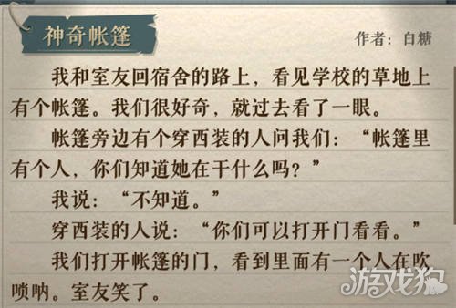 我和室友回宿舍的路上,看见学校的草地上有个帐篷。我们很好奇,就过去看了一眼。