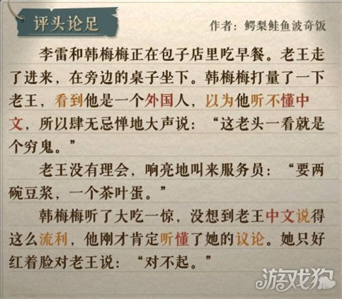 李雷和韩梅梅正在包子店里吃早餐。老王走了进来,在旁边的桌子坐下。韩梅梅打量了一下老王,看到他是一个外国人,以为他听不懂中文,所以肆无忌惮地大声说:" 这老头一看就是个穷鬼。
