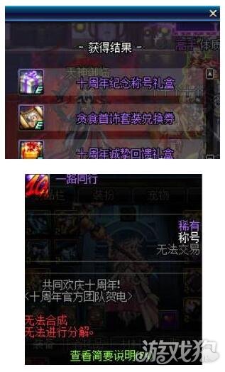 十周年纪念称号礼盒: 开启后, 可以选择获得1个十周年纪念称号【一路同行】该称号无法合成和分解,且无法交易,没有删除日期