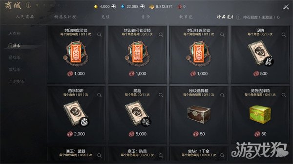 3、门派玩法:产出灵锁,可通过门派活动积攒门派币,在商城-珍品兑换里进行兑换。