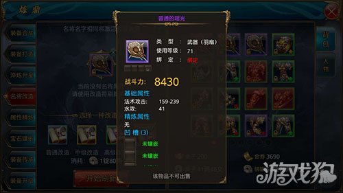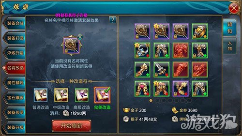 名将属性也有品质之分,和装备一样有五种颜色品质,紫色最佳白色最次。玩家如果觉得名将属性太低,可以通过基础、中级、高级、完美这四大改造过程进行改造。在炼鼎系统中花费一张名将改造符对名将属性进行改造,就可以获得更高品质的装备了。