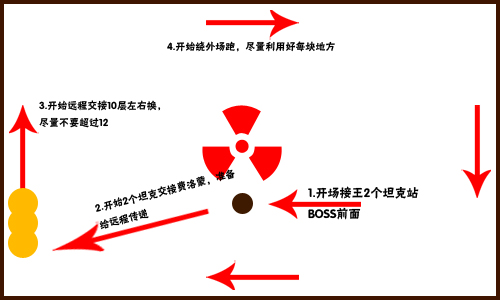 P1阶段其实和普通没什么区别,但是难点还是P1,巨大的治疗压力,让团队一直处于高危情况,每一次碾碎都会有意外的发生,开场2个坦克先上保持在王的正面,去吃费洛蒙,2个坦克大概15-18层交接,然后开始给远程传递交接,第一个远程去的时候骑士最好能给一个保护防止吃到狂怒挥击的伤害,远程大概10层左右费洛蒙交换,(尽量开场给暗牧术士这样的减伤高的远程去交接)交接的时候来接的人不要动站在前面等,给有费洛蒙的用户传染到后走开再移动,(经常会有意外发生导致层数过高团队崩盘)这里走开也不能太快不要开什么火箭靴之类的因为BOSS有个延迟时间会盯着上一个人如果挥击到团队那基本也灭了。