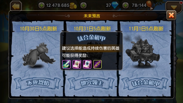 目前预言池一共5个BOSS,产出需求量比较大的龙心卷轴、大炮卷轴等装备碎片,每个BOSS都分6种难度,奖励随难度递增,需要不同的英雄组合才能通关。