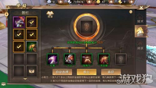 不过既然是概率性事件,如何节约成本就是最重要的地方了。由于炼化系统中即使是放入4个同品阶坐骑,也仅有50%的概率炼化出高品阶坐骑,因此为了将损失减少到最小,建议玩家每次炼化,都用5个坐骑来进行,这样就有100%的成功率。你要说你运气总是爆棚?那你也可以尝试用2个坐骑炼化,如果人品好炼化出高等坐骑,就尽可以到处炫耀了哦。