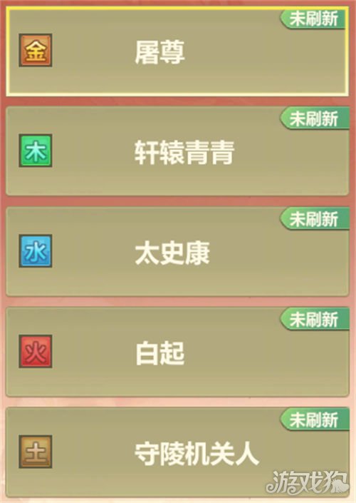 5位将领的五行属性是固定的:屠尊-金、轩辕青青-木、太史康-水、白起-火、守陵机关人-土。