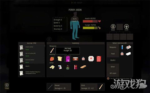 如果说《空山求生记》(//www.sonkwo.com/products/1800)的故事情节有点儿像"死亡岛"的话,玩儿法上则是求生题材巧妙的套在了roguelike框架上。游戏中玩家要注重物品的收集,武器、食物、医疗用品、日记等类别的物品被随机的摆放在了这百余层的大多数房间中,任何抽屉柜子花瓶等等都要搜刮彻底。某些收集的物品可以按照配方组合成各式各样的武器,而这些武器则在攻击力、灵活性等方面具有千差万别的属性,玩家需要结合实际情况灵活应用。看着下面游戏中库存的截图,是否有一种"DayZ"的既视感呢?