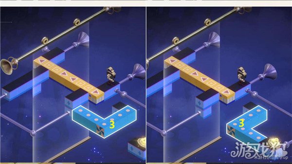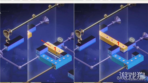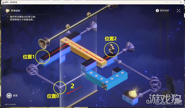 (23)最后再将1黄色模块拖拽移到下图位置,路线就会连通,钟表小子就会自动从2位置移动到3位置,解密完成,退出后再选择【唤醒】即可