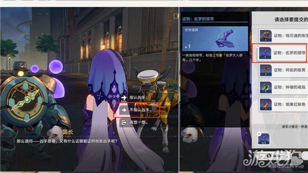 (24)完成上面后,会退出来到下图位置,然后选择【不指认凶手】后,选择提交第2个证物【佐罗的领带】即可
