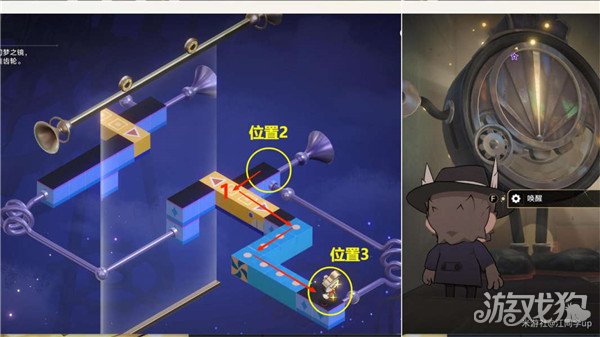 (9)完成拼图后,从左边1机关传送到2机关位置后去3花瓶位置,然后【调查】3花瓶选择【推动】,将3花瓶推下去打掉4怪物,然后在从3花瓶位置,从2机关传送回到下面1机关位置