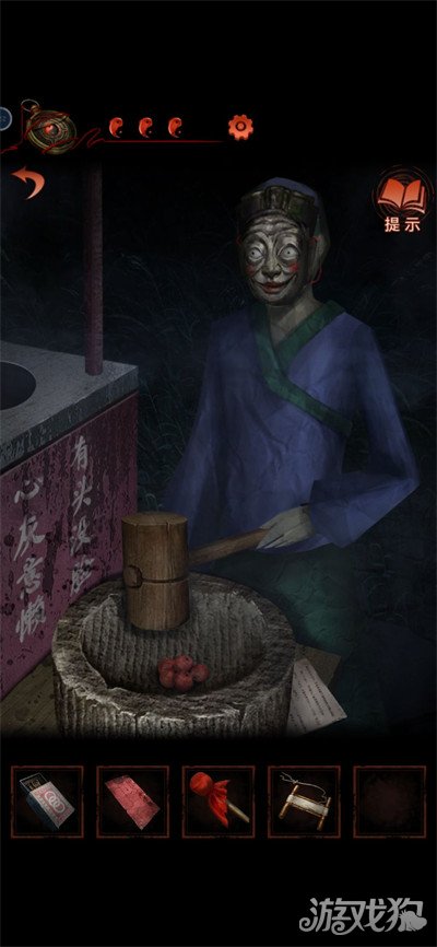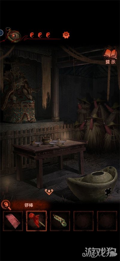 根据桌上书里的线索把礼盒摆供桌上,神像张开获得红绳,敲锣回二更,红绳给木偶(高能),挂到谜底上,获得报纸打开箱子