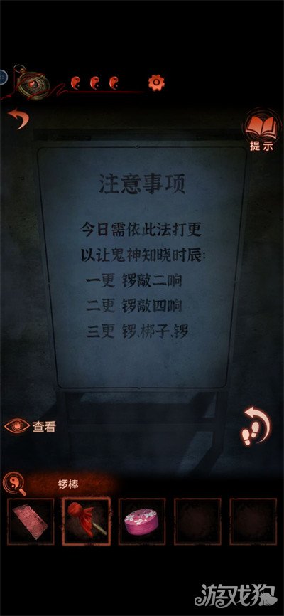 出现纸人,罗棒,根据线索敲锣,两下进入一更天